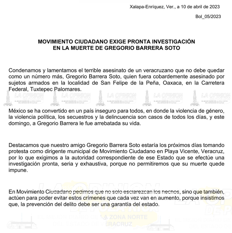 Condenamos y lamentamos el terrible asesinato de un veracruzano que no debe quedar como un número más, Gregorio Barrera Soto,…