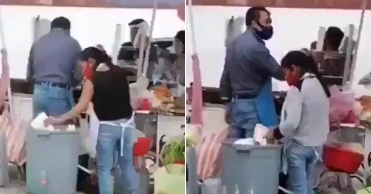 Graban a mujer sacando platos de la basura para reutilizarlos en puesto de comida en Ecatepec