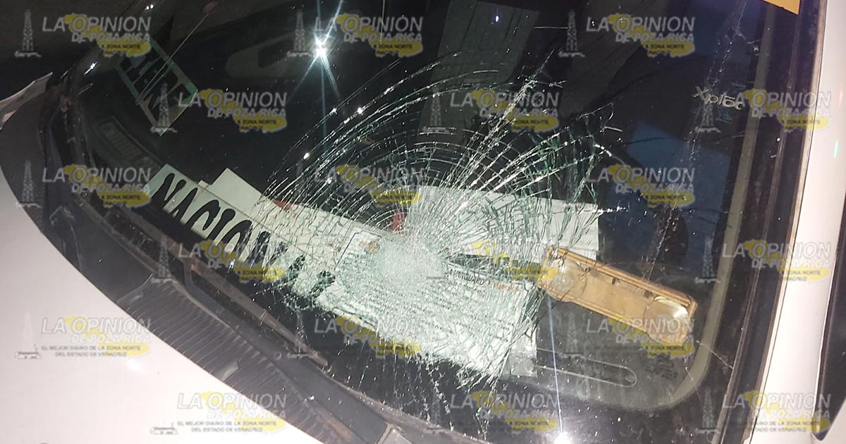Poza Rica, Ver.- Al filo de las dos de la mañana del lunes, el raudo y despistado conductor del taxi número económico 1345 de esta ciudad, colisionó contra una motocicleta Italika modelo FT180 que circulaba por la calle Guayacán de la colonia Chapultepec de esta ciudad, provocando que el motociclista volara por el aire para terminar chocando contra el parabrisas.