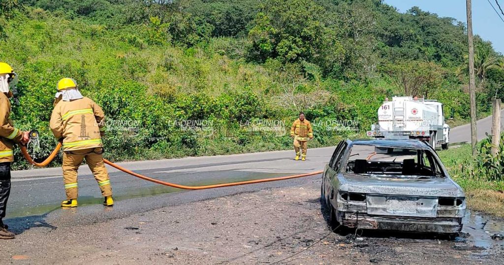 PAPANTLA, VER.- Un vehículo del servicio público en su modalidad taxi fue consumido en su totalidad por el fuego, esto cuando circulaba sobre la carretera El Chote-María de la Torre, por fortuna el conductor y sus acompañantes lograron salir a tiempo.