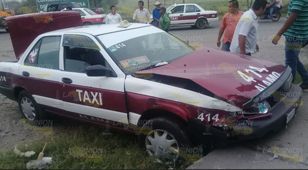 ÁLAMO, VER.- Un fuerte encontronazo provocado por un taxi que rebasaba en curva, dejó cinco pasajeros lesionados y al propio trabajador del volante; el accidente se registró al filo de las 09:00 horas en la carretera federal Álamo-Alazán a la altura de la desviación hacia la colonia Loma Bonita, en la localidad Chapopote Núñez.