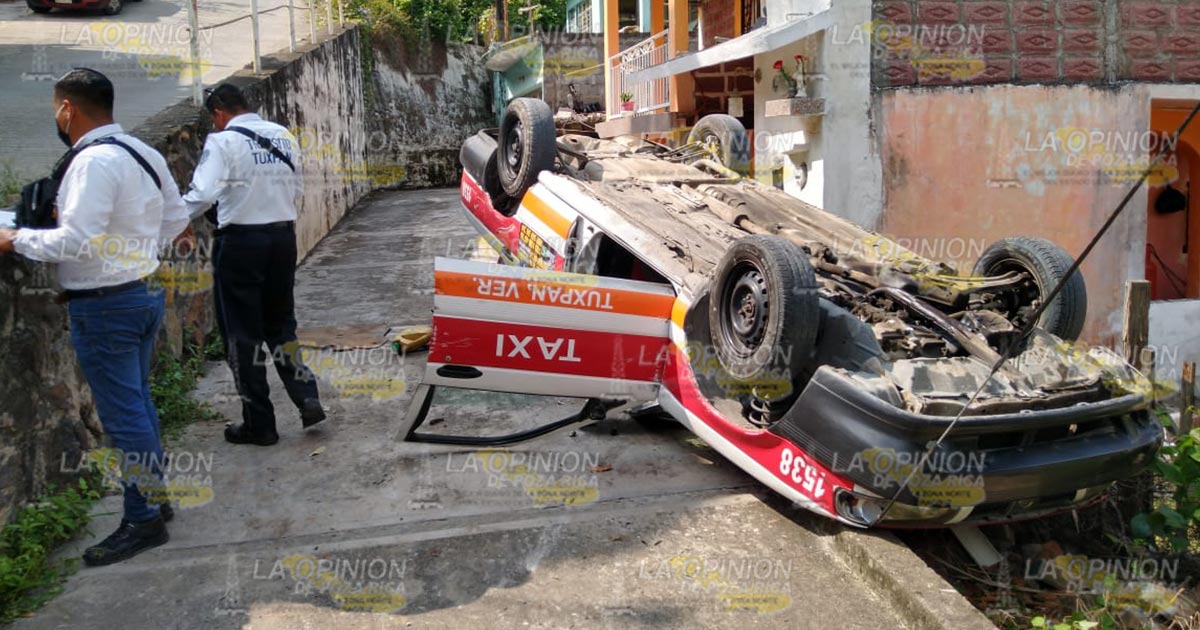 Tuxpan, Ver.- Taxi que se habría quedado sin frenos en el llamado “Cerro de la Paloma”, de la colonia Miguel Alemán, de esta localidad volcó y quedó con los neumáticos hacia arriba; su conductor resultó con lesiones leves pero no fue hospitalizado.