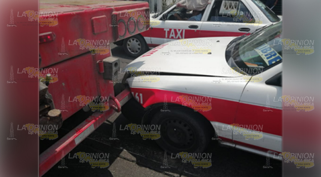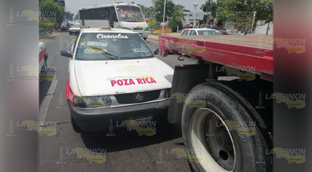 Poza Rica, Ver.- Severos daños materiales fue el saldo de un accidente automovilístico entre un taxi y un tráiler sobre el bulevar Adolfo Ruiz Cortines, a la altura de Garibaldi.