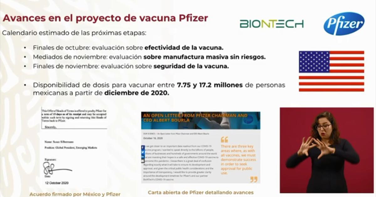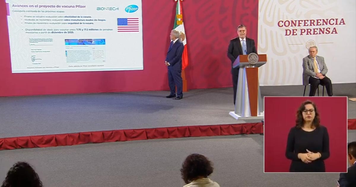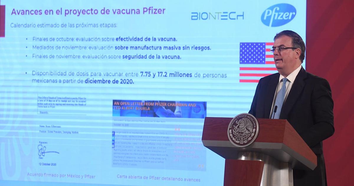 En la conferencia de prensa matutina, el canciller explicó que, en una carta abierta, tanto Pfizer como Biontech se comprometieron a que a finales de noviembre podrán demostrar la efectividad de la vacuna, que se puede tener manufactura sin riesgos a gran escala y que es segura para las personas.