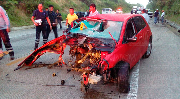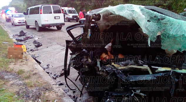 Tres de los muertos se encuentran prensados entre los fierros retorcidos de los dos coches y hasta este momento se espera el arribo de la Cruz Roja delegación Poza Rica con equipo hidráulico especializado para rescatar los cuerpos.