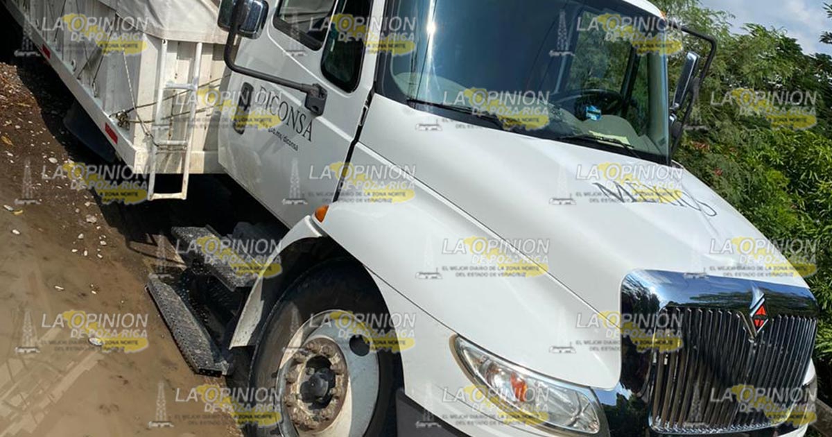 Coxquihui, Ver. – Tremendo susto se llevó el conductor de un camión de Diconsa que estuvo a punto de volcar sobre un arroyo, luego de caer a un hueco, cerca de la comunidad de Ojite de Matamoros.