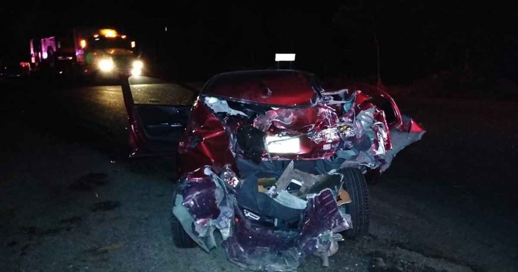 Después del impacto el Sentra habría girado sobre su eje para terminar sobre la zona de rodamiento completamente destruido de su parte posterior, mientras el enorme camión, color blanco, terminaba fuera de la carretera, volcado sobre su lado derecho, a orilla del carril contrario al que circulaba.