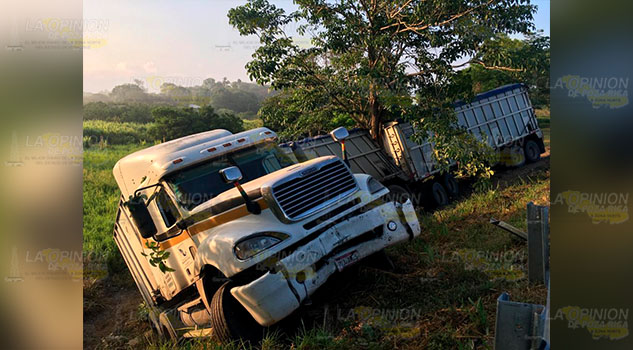 Tuxpan.- Tráiler doble remolque que se desplazaba hacia la zona de graneleras, de este puerto terminó fuera de la carretera luego de que su conductor perdiera el control al esquivar un auto que se le atravesó por fortuna no hubo víctimas que lamentar, la unidad quedó con elevados daños materiales y tuvo que ser remolcada al corralón.