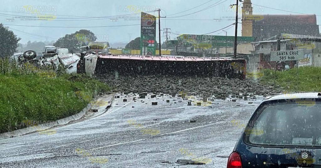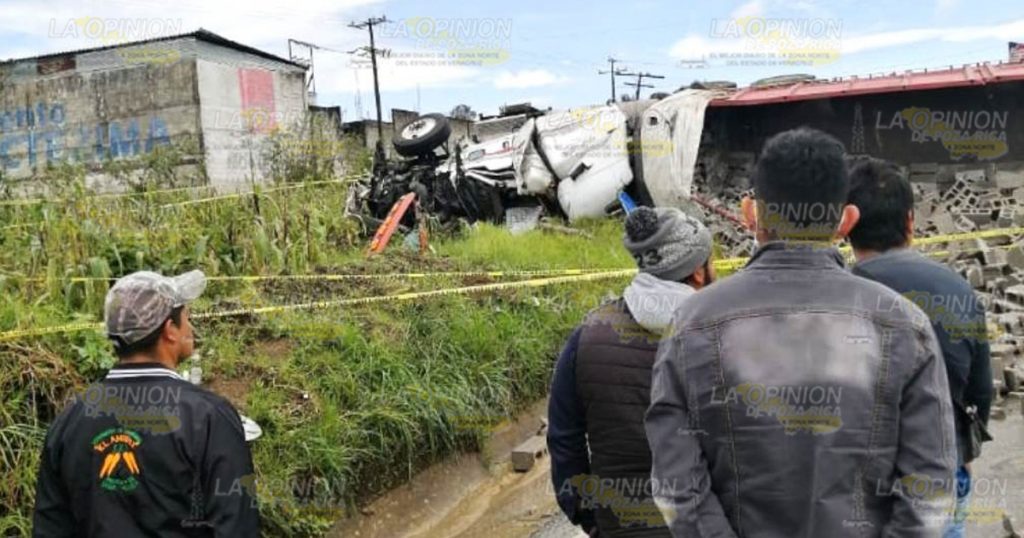 Altotonga, Ver.- Trágico accidente se registró la tarde de este jueves en el tramo federal que conduce a Jalacingo a la altura del lugar conocido Santa Cruz, lugar en donde un tráiler cargado de block se quedó sin frenos y terminó volcándose, el chofer quedo sin vida entre los fierros retorcidos.