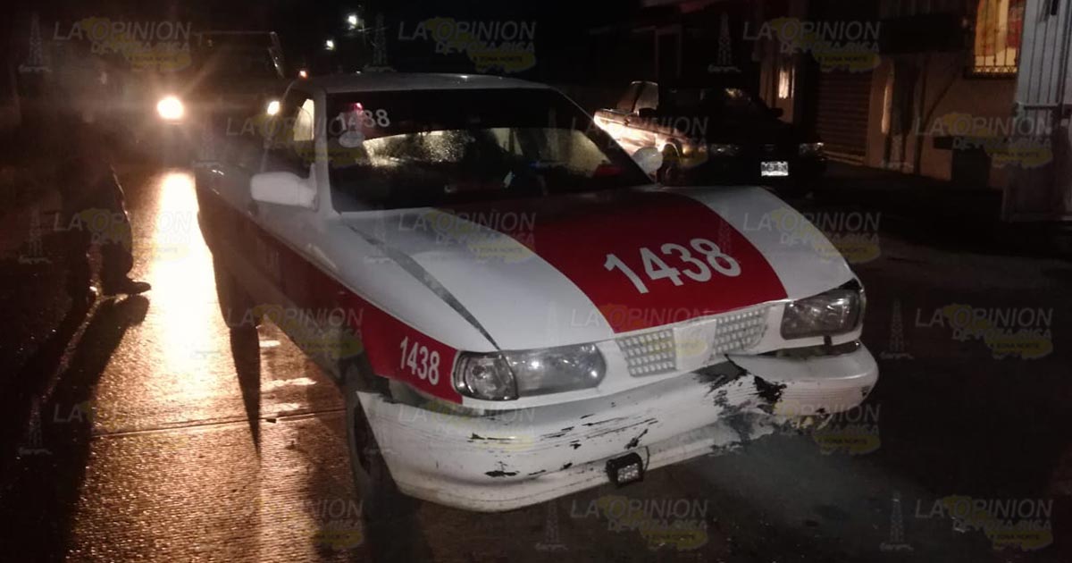 Tuxpan, Ver.- El choque de un automóvil compacto y un taxi dejó como saldo cuantiosos daños materiales; elementos de Tránsito y Vialidad aseguraron los vehículos y al presunto responsable.