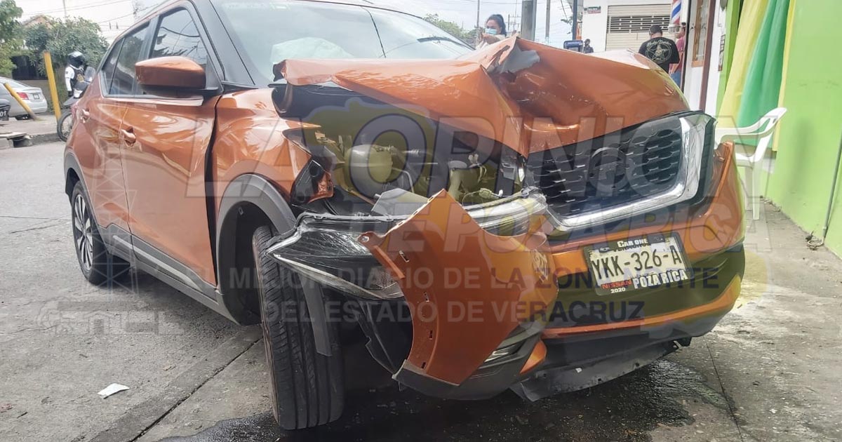 La camioneta es una Kiks de la Nissan, de color Anaranjado, que circulaba por la calle Nogal, la cual quedó destrozada completamente de la parte delantera y quedo arriba de la banqueta, después del percance.