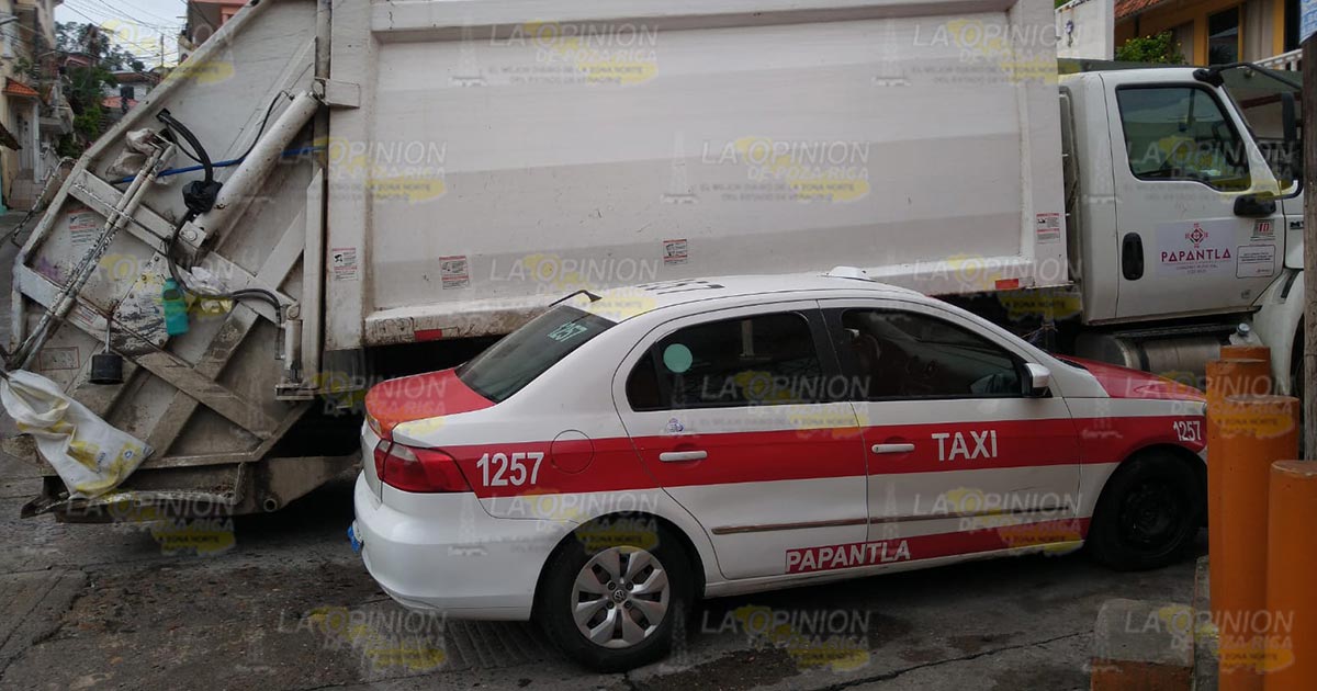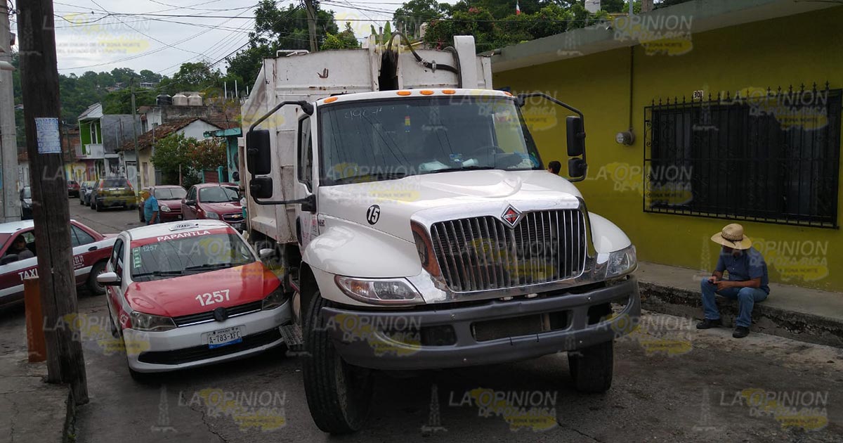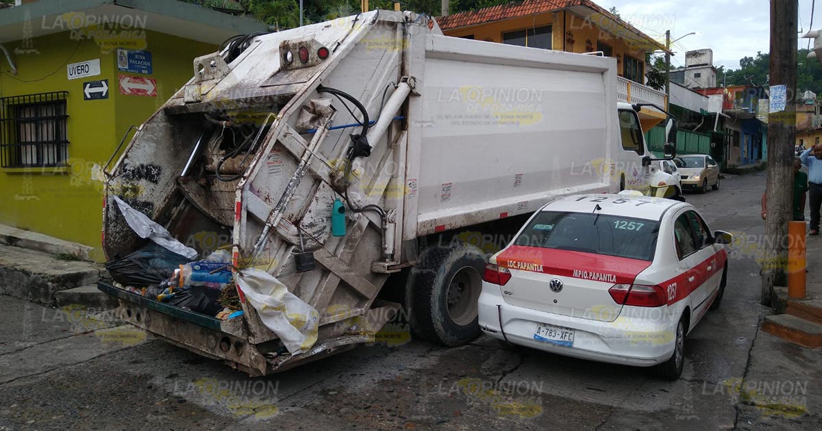 PAPANTLA, VER.- Daños materiales por miles de pesos fue el saldo que dejó un aparatoso accidente registrado la mañana de este jueves, el cual fue protagonizado por un camión recolector de limpia pública y un vehículo de alquiler, por fortuna no hubo personas lesionadas.