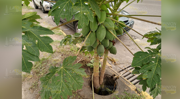 Frente a la clínica 72 del IMSS, en esta ciudad, ha crecido al interior de un drenaje una planta de papaya. “Es de la buena”, dice un derecho habiente que come una fruta sobre la acera del bulevar Central Poniente.