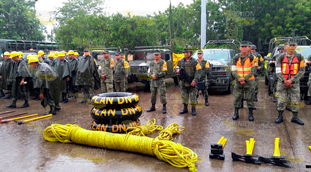 Tuxpan.- Con motivo de la activación del plan DN-III-E, arriban al puerto un contingente de 60 elementos del 5/o. Batallón de Ingenieros de Combate, para integrar un equipo de trabajo en las instalaciones del 39/o. Batallón de Infantería.