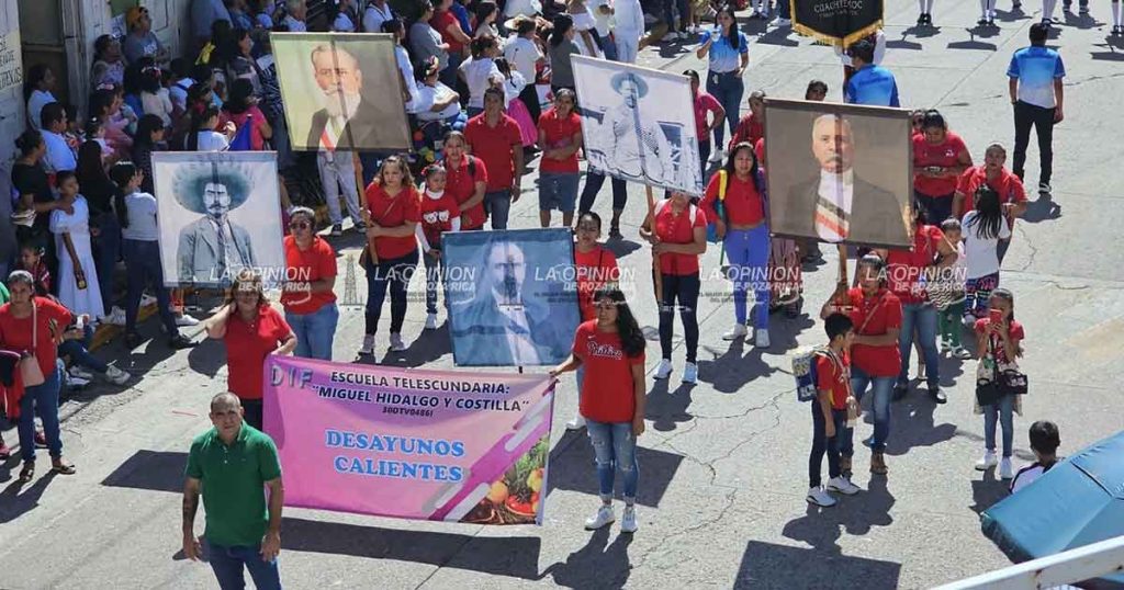 El desfile fue encabezado por el alcalde Leobardo Gómez González, acompañado de su esposa Patricia Ortiz, así como integrantes de la comuna, además de docentes y estudiantes de distintas escuelas y empleados de confianza y sindicalizados del ayuntamiento.