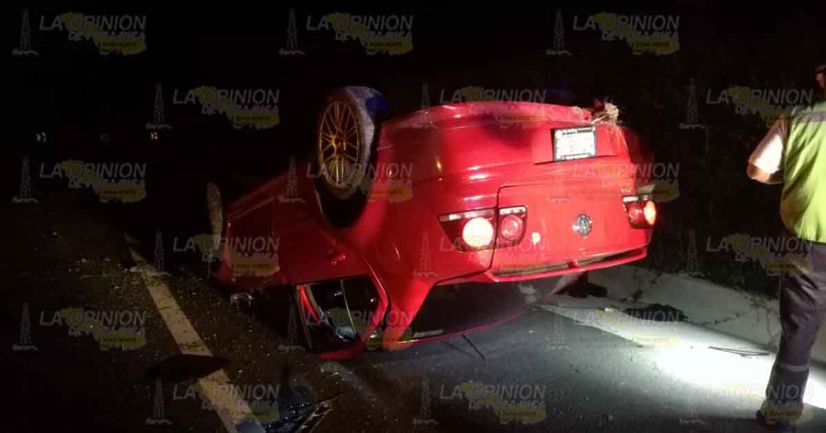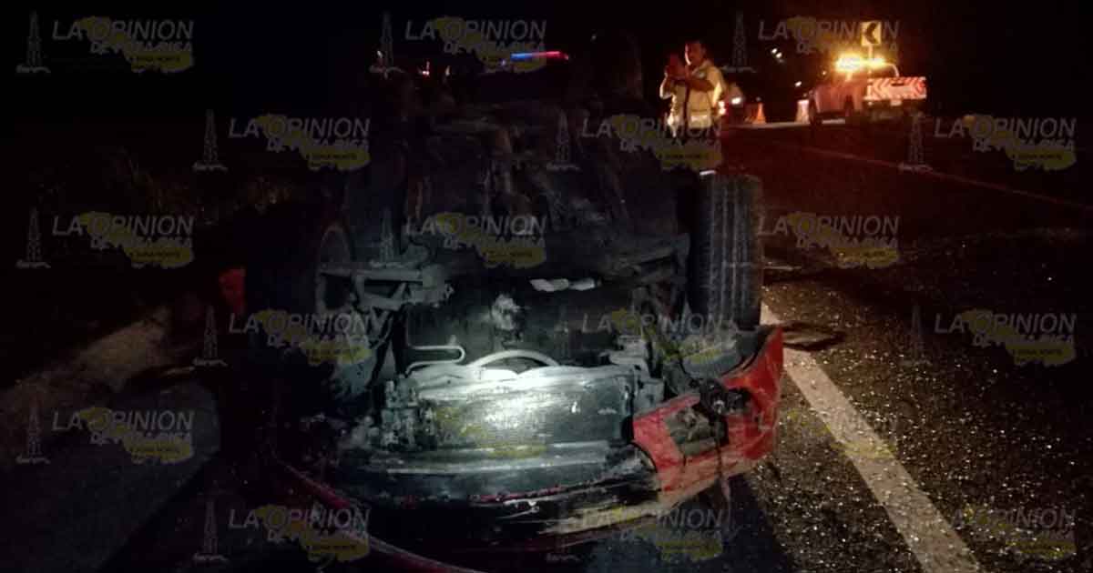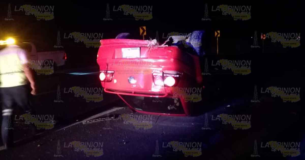 El automóvil accidentado es un Volkswagen Jetta, color rojo, con placas de circulación YJT 9516 del Estado, el cual tras presuntamente haber sido impactado por un tráiler y dio volteretas sobre la carpeta de rodamiento.