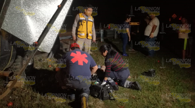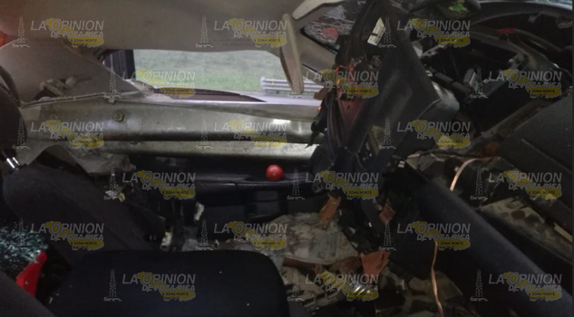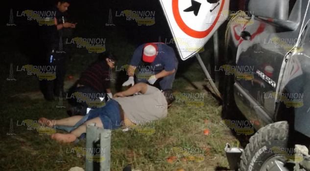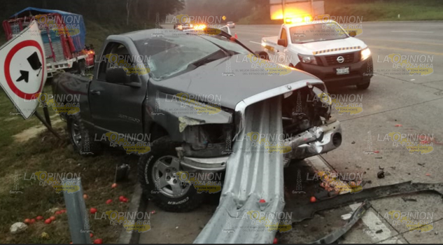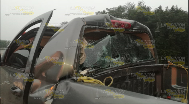 Tuxpan.- Comerciantes de este puerto, salvaron la vida de milagro luego de que la camioneta en la que viajaban quedara destrozada al literalmente ser atravesada por la barra metálica de contención; es de mencionar que uno de los ocupantes de la unidad tuvo que esperar tirado a un costado de la unidad, más de una para que una ambulancia de la Cruz Roja Mexicana lo trasladaran al Hospital Civil Emilio Alcázar.