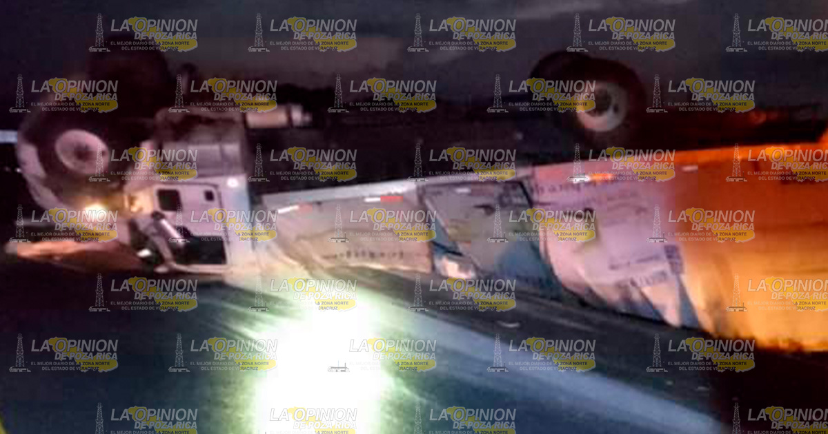 NARANJOS, VER.- Operador de un tráiler volvió a nacer milagrosamente, luego de que la unidad que conducía volcó de manera aparatoso sobre la autopista Tuxpan-Tampico durante la madrugada de este miércoles, reportaron autoridades.