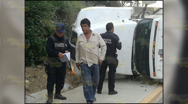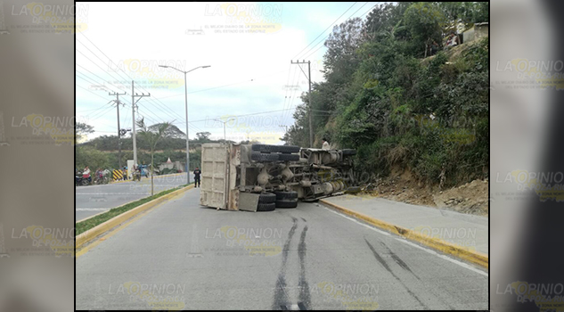 Tuxpan.- Camión materialista volcó aparatosamente sobre el libramiento Adolfo López Mateos de esta ciudad, dejando como único saldo cuantiosos daños materiales; el conductor -según su testimonio- mencionó que una mujer se le habría atravesado y esto provocó que perdiera el control.
