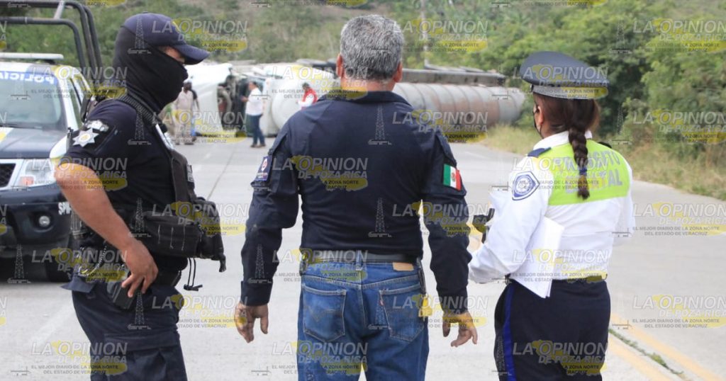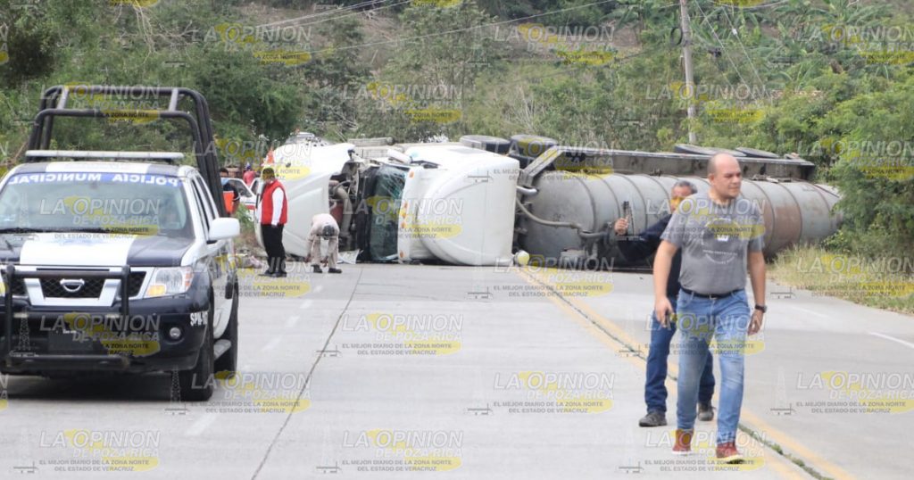 Papantla, Ver.- Debido a un presunta falla mecánica en uno de los neumáticos, una pesada pipa cargada con alrededor de treinta mil litros de residuos de hidrocarburo terminó volcando de forma aparatosa, dejando daños materiales, así como afectaciones sobre la carpeta de concreto.