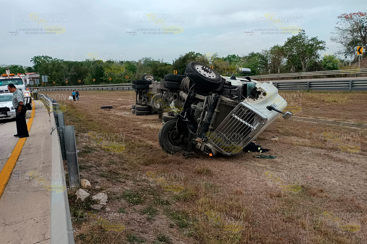 Tuxpan, Ver.- Pipa de la empresa Dilver Oil&Gas volcó en la autopista México Tuxpan y deja como saldo elevados daños materiales; su conductor resultó lesionado, autoridades toman conocimiento y remiten el vehículo al corralón.