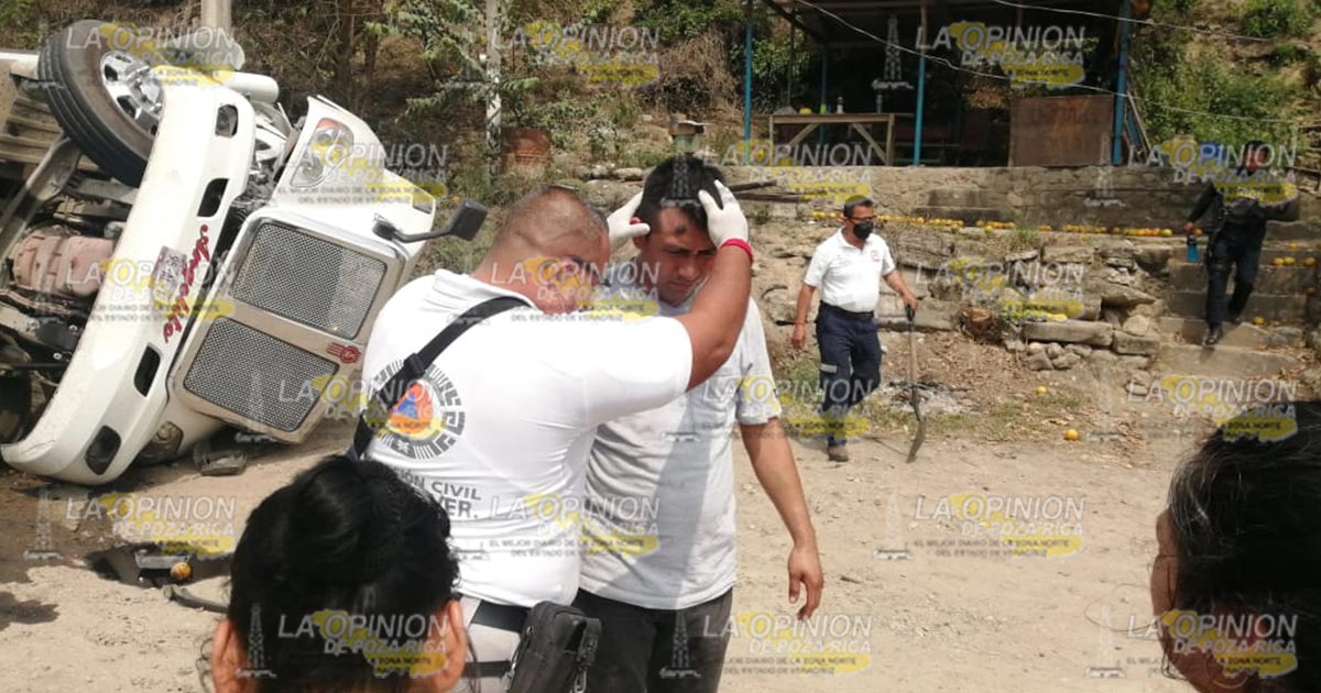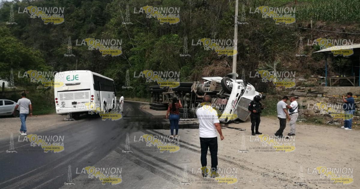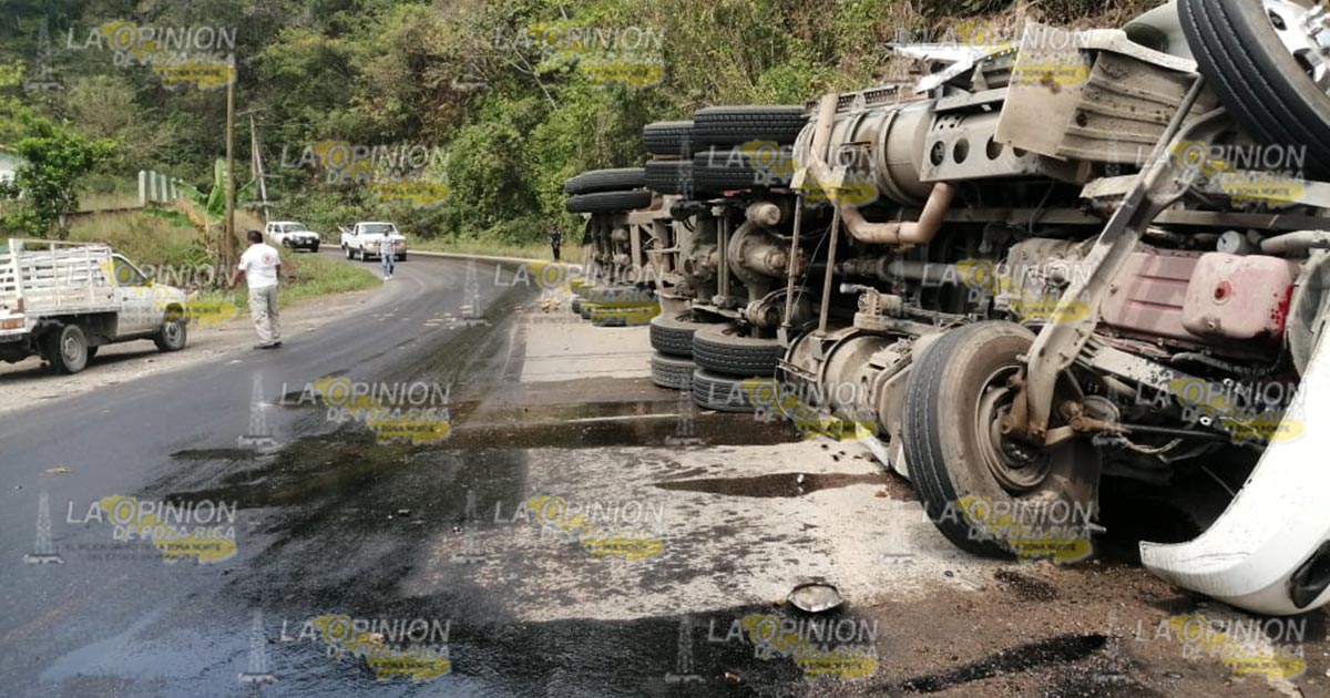 Papantla, Ver.- Aparatosa volcadura se registró la mañana de este lunes sobre el tramo carretero Poza Rica-María de la Torre, a la altura del puente Remolino, donde el conductor de una pesada unidad perdió el control del vehículo y terminó recostado sobre uno de sus costados.