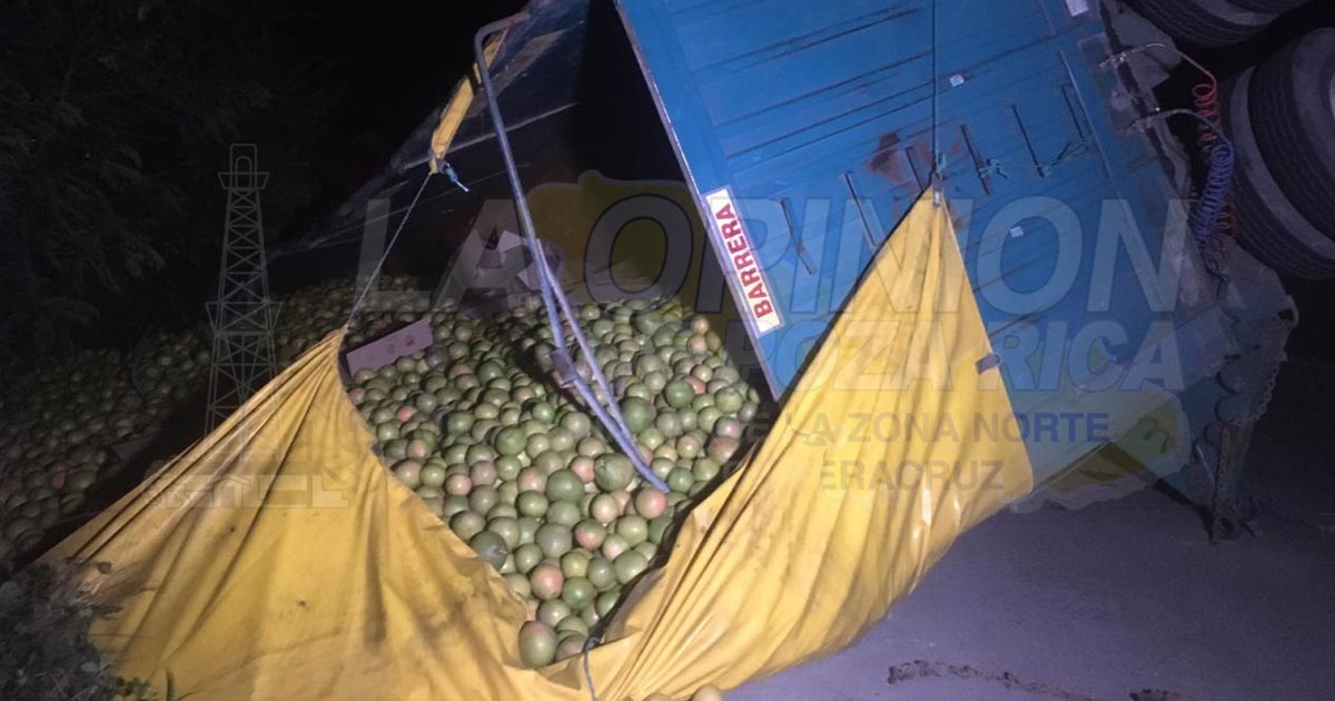 Papantla, Ver.- Aparatoso accidente se registró la noche de este viernes sobre el bulevar Tajín tras la volcadura de un tráiler cargado de producto cítrico, no se reportaron personas lesionadas, personal de tránsito y seguridad vial tomó conocimiento de los hechos.