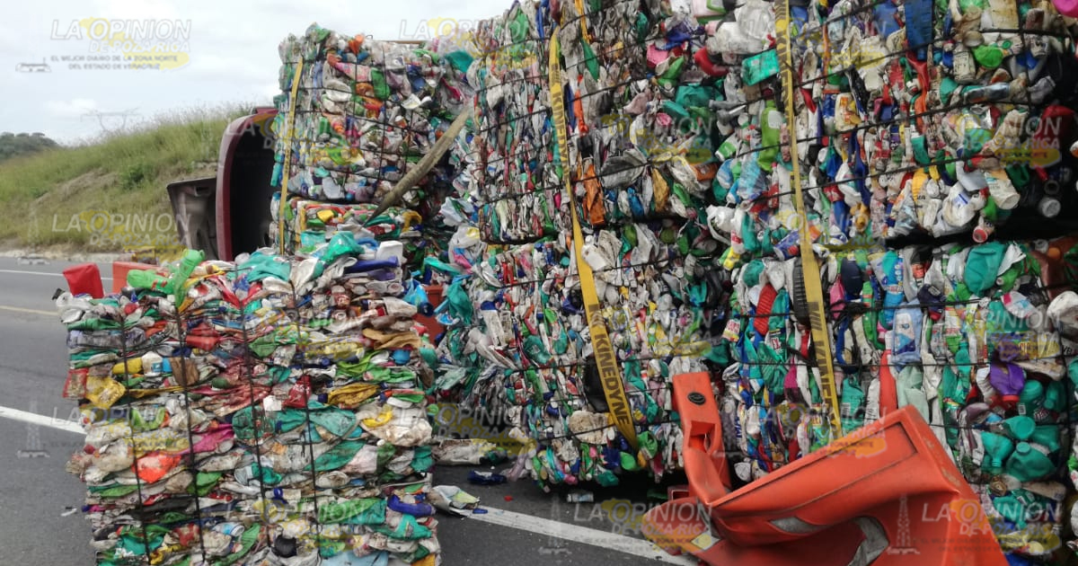 Tuxpan, Ver. – Un tráiler que transportaba un cargamento de PET y plástico reciclado volcó de forma aparatosa, pero por fortuna no hubo víctimas que lamentar; fue necesario una grúa de gran tonelaje para poder remolcar la unidad hacia el corralón.